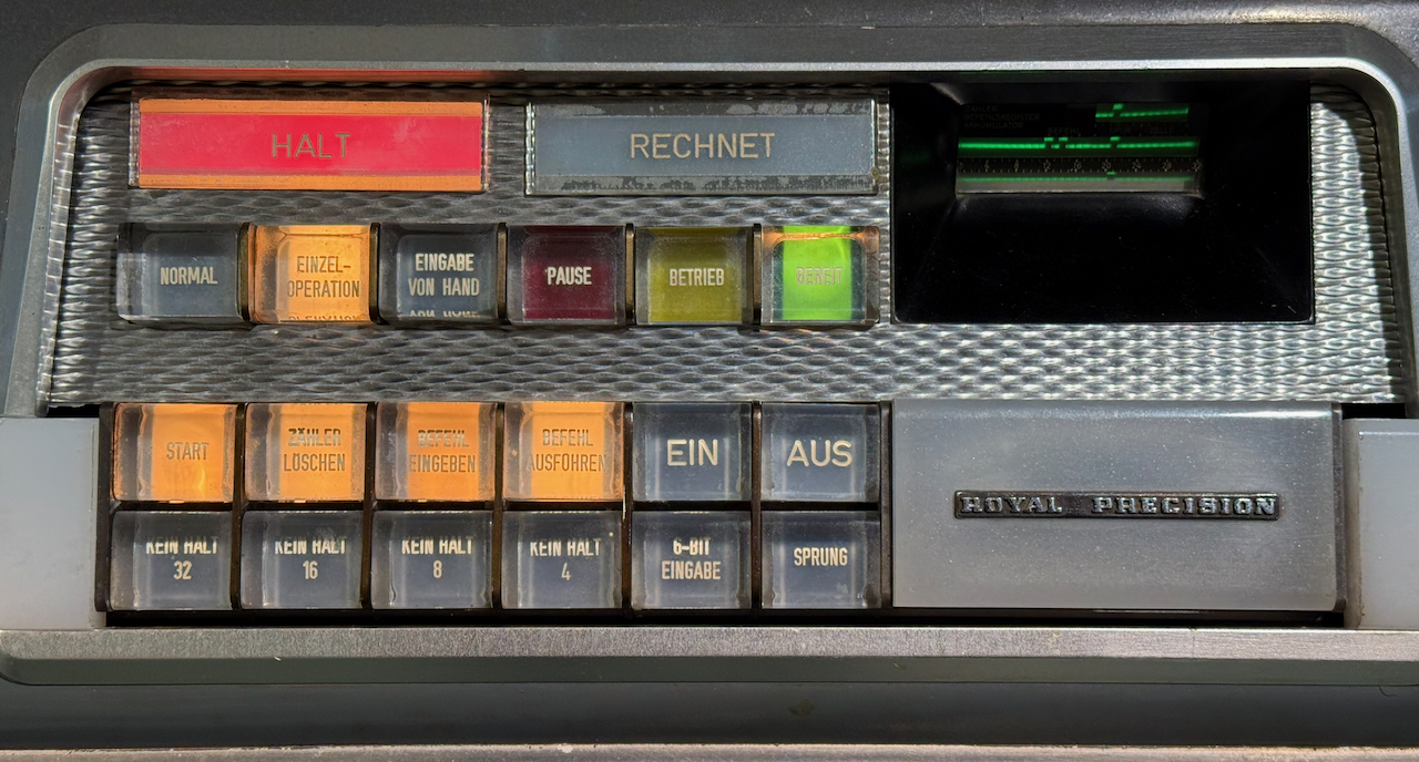 Im jetzigen Zustand liest die LGP30 beim Hochfahren das Trommelabbild von der Speicherkarte ein und zeigt die Registerinhalte an. Mit den Schaltern der Konsole kann man die div. Speicherworte nacheinander anzeigen. Bei der probeweisen Eingabe vom Flexowriter ergaben sich aber Fehler bei der Übergabe der Daten in den Akkumulator, die auf dejustierte Schalterkotakte des Flexowriters zurückgeführt werden konnten. Hier steht jetzt eine Neujustage an...